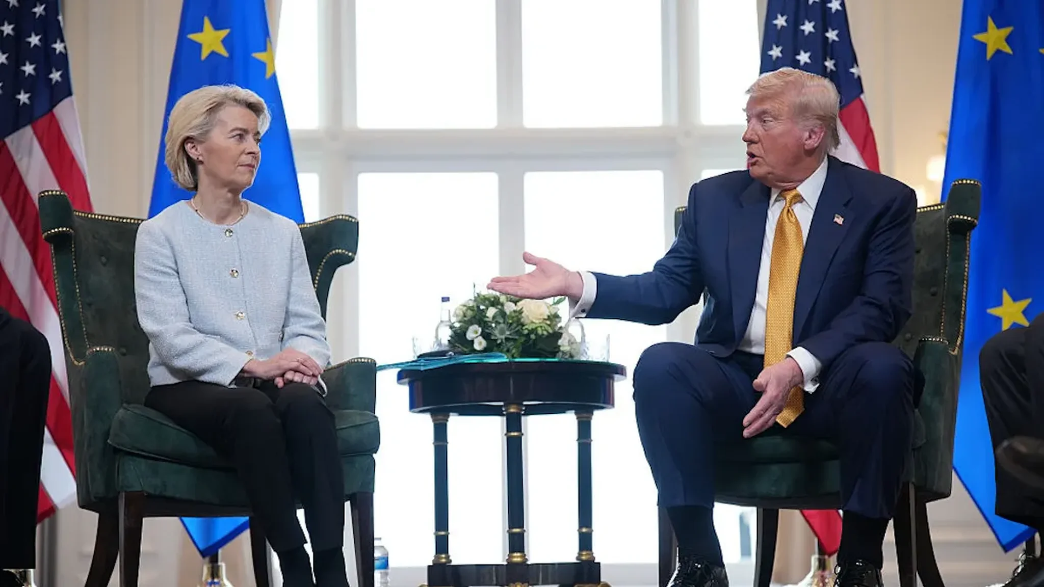 Durante a crítica de Trump à energia eólica, a presidente da Comissão Europeia, Ursula von der Leyen, estava ao seu lado. Von der Leyen, que é da Alemanha, tem apoiado a energia eólica e as renováveis em geral, enquanto os preços da energia em seu país dispararam sob a “Energiewende”, uma tentativa de transitar a rede elétrica da Alemanha dos combustíveis fósseis e da energia nuclear para as renováveis.
